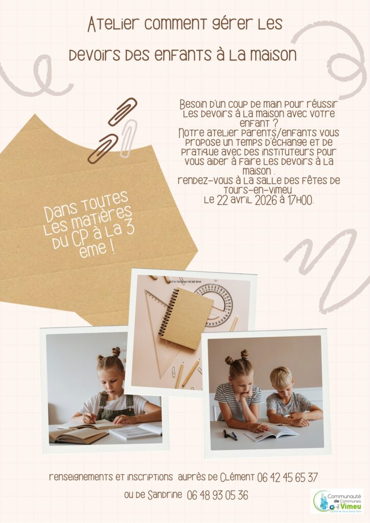 22 avril : Comment gérer les devoirs des enfants à la maison, dans la salle des fêtes de Tours-en-Vimeu